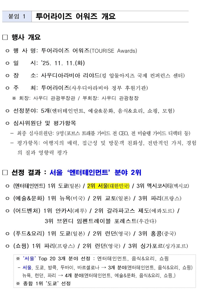 11일(화), 사우디아라비아의 리야드에서 열린 투어라이즈 시상식에서 5개 분야별 최고의 여행지가 발표되었으며, 서울은 엔터테인먼트 분야 여행 목적지로서 세계 2위에 올랐다.