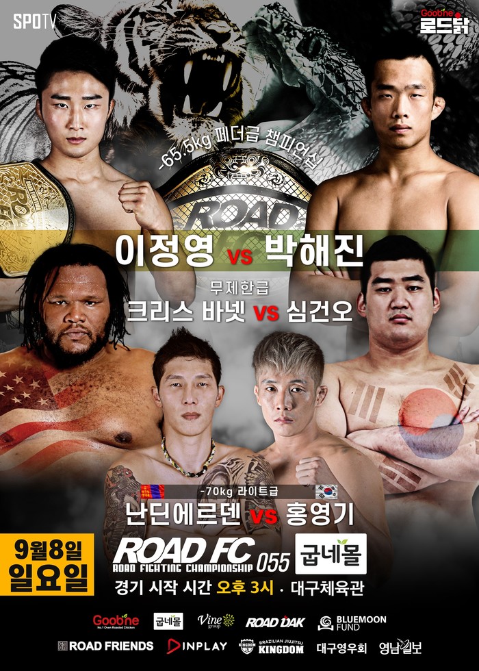 [세계타임즈 김인수기자] ROAD FC (로드FC)는 9월 8일 대구체육관에서 굽네몰 ROAD FC 055를 개최한다. ‘페더급 챔피언’ 이정영의 1차 방어전이 확정, ‘도전자’ 박해진과 메인 이벤트에서 대결하게 됐다.