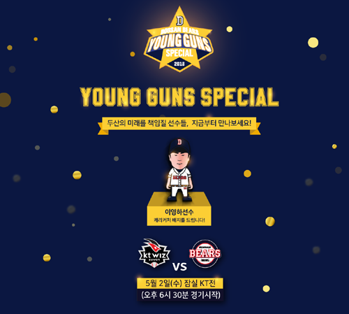 [ 세계타임즈 김인수 기자 ] 두산베어스(社長 田豐)가 5월 2일(수) 잠실구장에서 열리는 KT와의 홈경기에서 ‘영건 스페셜(Young Guns Special)' 이벤트를 실시한다.