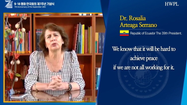 이날 축사에 나선 에콰도르 로살리아 아르테아가 세라노 에콰도르 전 대통령은 “평화를 위해서 모두 함께 일하지 않는다면 평화는 결코 이룰 수 없을 것”이라며 “더욱 공정하고 안정적이며 평화로운 세계를 만들 수 있도록 아이들과 청년들, 성인들에 이르기까지 언어적 폭력을 멈추고 부당함과 차별을 근절하기 위해 나서야 할 것”이라고 말했다.