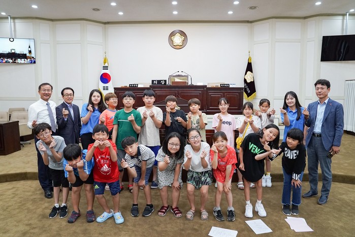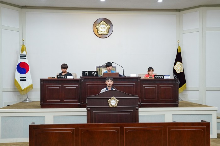 이후 학생들은 의장과 의원, 공무원으로 역할을 분담해 5분 자유발언, 안건상정을 비롯한 토론 및 질의 응답 등 실제 의사진행과 동일한 시나리오로 임시회를 개회하고 부의된 안건을 의결하는 등 모의의회를 직접 체험하는 소중한 시간을 가졌다.