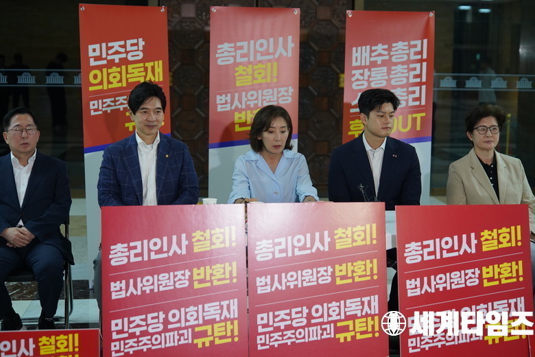 국민의힘 '나경원' 의원이 27일 국회 로텐더홀에서 김민석 국무총리 후보자의 지명 철회, 법제사법위원장 반환을 촉구하며 농성을 하고 있다.