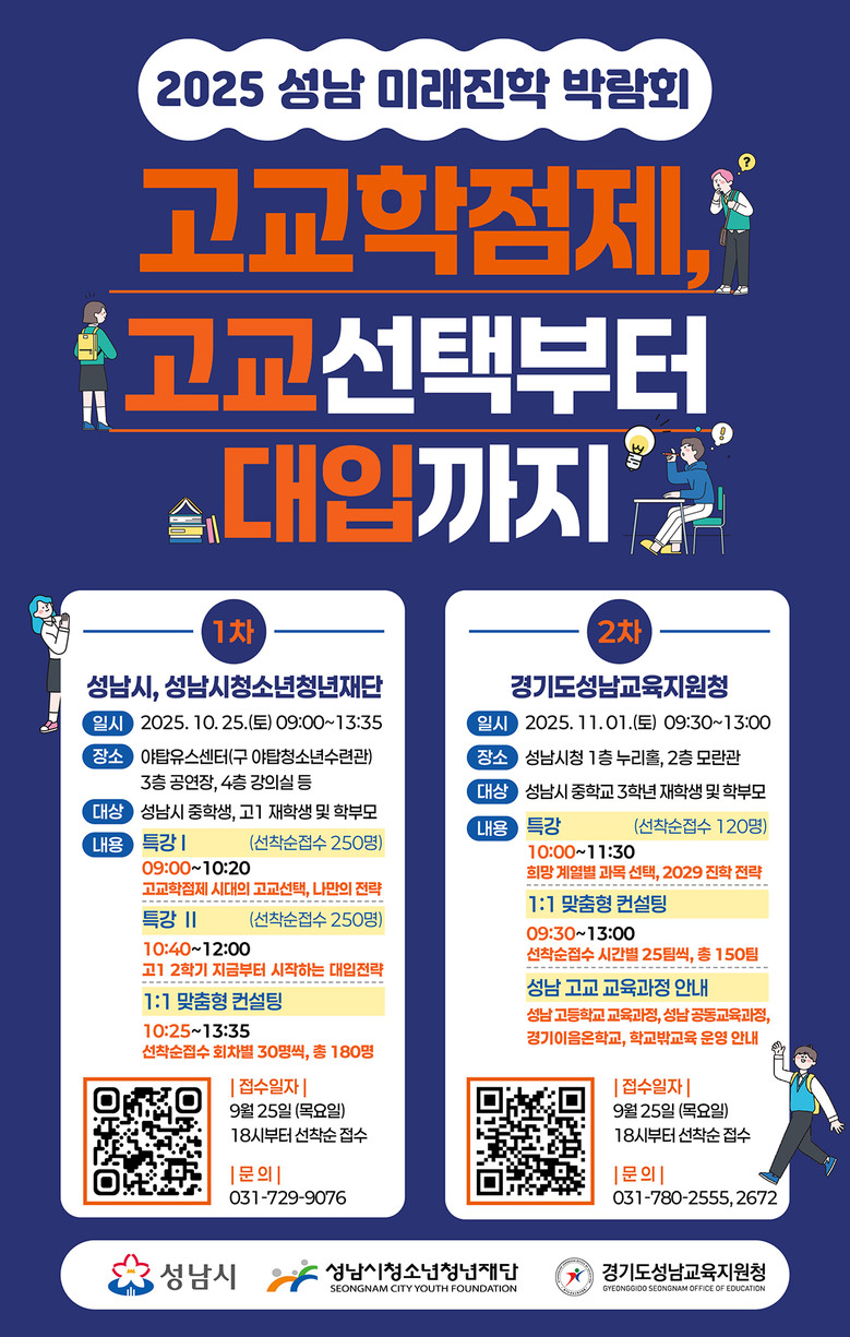 한편, 미래진학박람회 참가 신청은 9월 25일 목요일 오후 6시부터 선착순 온라인 접수로 진행되며, 자세한 사항은 성남시청소년청년재단 또는 경기도성남교육지원청으로 문의하면 된다.