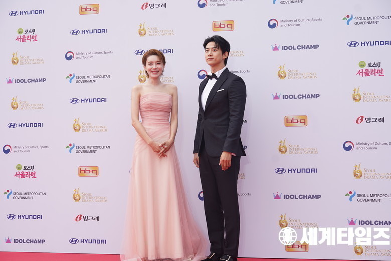 제20회MC를 맡은'장도연'과옥택연'이 2일 오후 서울 영등포구 여의도 KBS에서 열린 2025 서울드라마어워즈 레드카펫 행사에 참석해 포즈를 취하고있다.