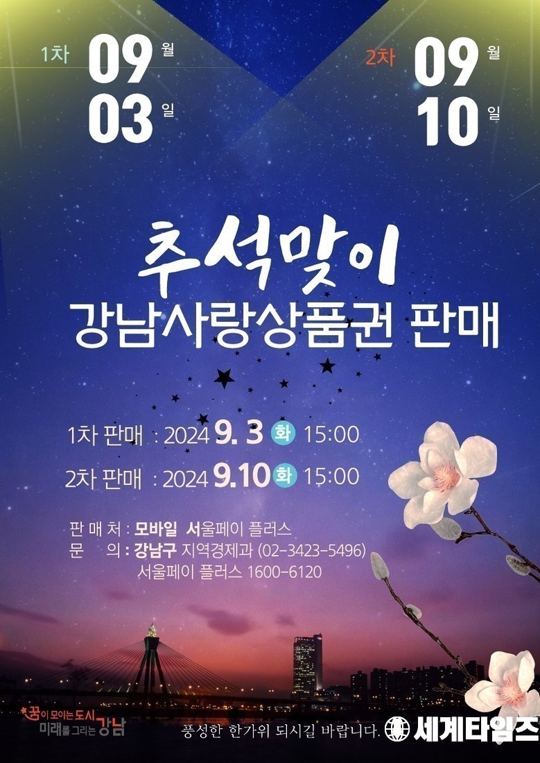 꿈이 모이는 도시, 미래를 그리는 강남구(구청장 조성명)가 한가위를 맞아 9월 3일과 10일 오후 3시 두 차례에 걸쳐 강남사랑상품권 300억 원을 발행한다. 1차(3일) 정기발행은 시-구 매칭 예산으로 80억 원을, 2차(10일)는 전액 구비로 220억 원을 자체 발행한다.