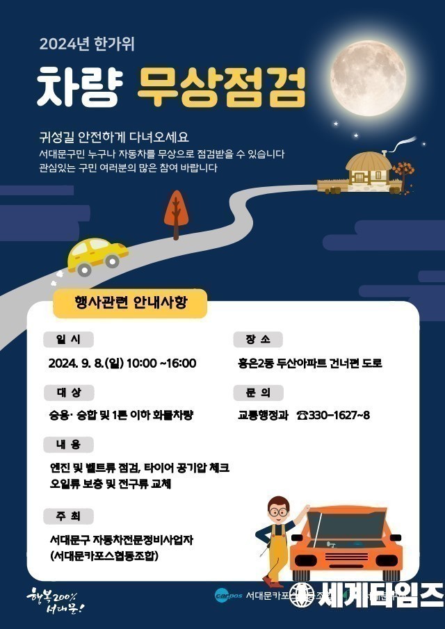 [세계타임즈=신상철 기자] 서대문구(구청장 이성헌)가 추석 명절을 맞는 주민들의 안전한 차량 이용을 위해 ‘서울시자동차전문정비사업조합 서대문지회’와 함께 차량 무상점검을 실시한다.