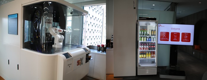 5G 카페테리아는 AI무인자판기, 바리스타 로봇 등이 있다. AI무인자판기는 영상분석 기술을 통해 직원을 인식하고 음료를 꺼내 가면 자동으로 정산된다. 향후, VR소셜 노래방 등의 기기를 도입하여 직원들 휴식을 질을 높일 계획이다.