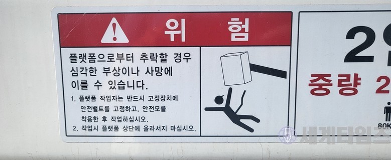 ▲  플랫폼에 탑승시 위험 경고 무시하고 고소 작업중