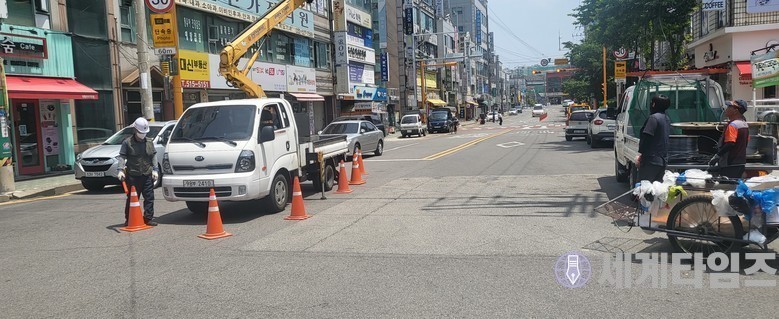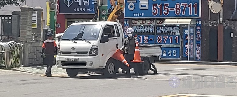 ▲  위 사진을 촬영하고 지나치자 그냥 작업 도중 재 촬영하는 것을 확인하고 부랴부랴 안전고깔 배치
