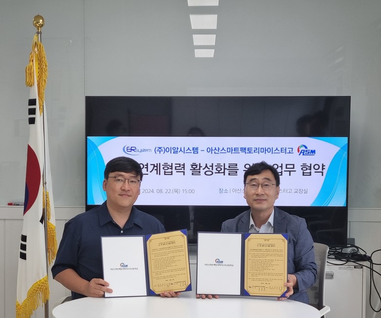 [아산시 세계타임즈=백택기 기자] 아산스마트팩토리마이스터고등학교(교장 조동헌)와 (주)이알시스템(대표이사 오승훈)은 지난 8월 22일 상호 연계협력 활성화를 위한 업무협약을 체결했다.