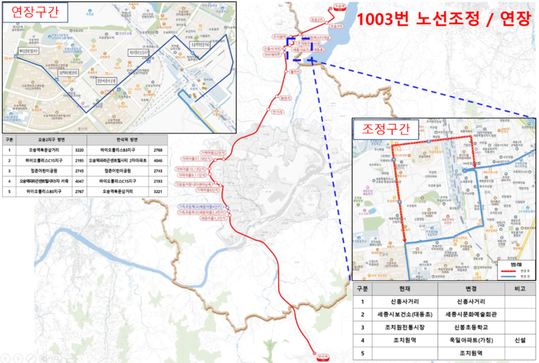 주요 변경 사항으로는 세종시 구간에서 기존 1005번 노선과 중복되는 대첩로(대동초) 구간을 조정해 ▲세종시문화예술회관 ▲신봉초등학교 ▲욱일아파트를 경유하도록 변경했다.