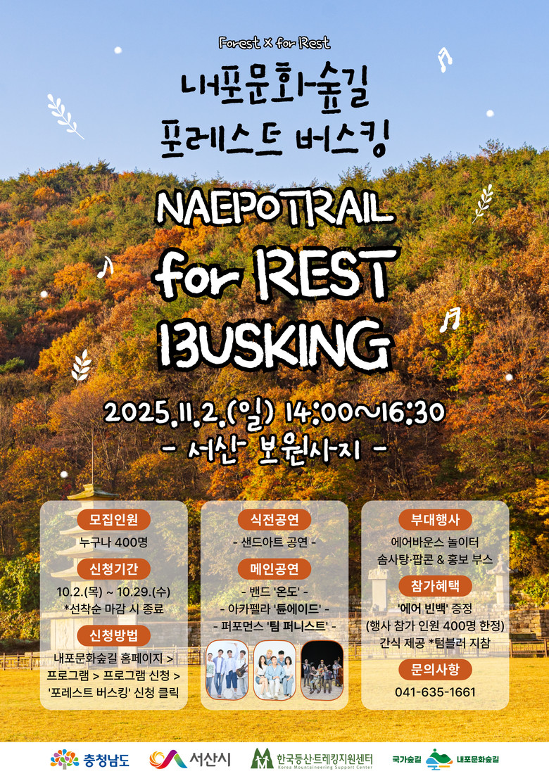 이번 행사는 국가숲길이자 충남 대표 숲길인 내포문화숲길에서 가을의 정취와 함께, 자연 속 휴식과 문화가 공존하는 시간을 선사하기 위해 마련했다.