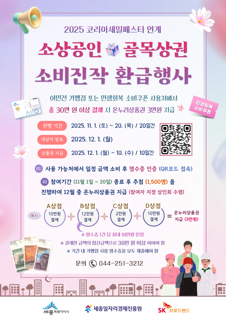 코리아 세일 페스타에서 이뤄지는 소비진작 환급행사는 30만 원 이상 결제한 영수증을 시 누리집(sejong.go.kr)이나 세종일자리경제진흥원(sjepa.or.kr)에 게시된 홍보물의 정보무늬(QR)코드를 통해 인증하면 된다.