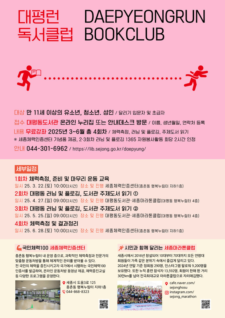 이번 프로그램은 세종체력인증센터(센터장 이영민), 세종마라톤클럽(회장 황모세)의 협력과 재능기부를 통해 진행된다.