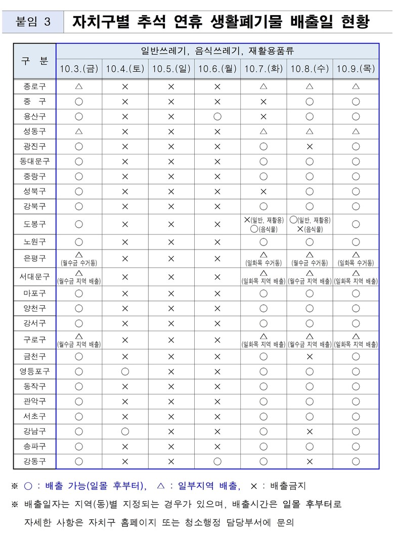10.5.(일)은 25개 자치구에서 배출이 금지되며, 연휴 첫날인 10.3.(금)과 마지막날인 10.9.(목)은 일부 지역(동)을 제외한 전 자치구에서 배출이 가능하다. 10.3.(금)~10.9.(목) 7일간의 연휴 기간 동안 자치구 별 배출일이 다르므로 배출 전 확인이 필요하다.