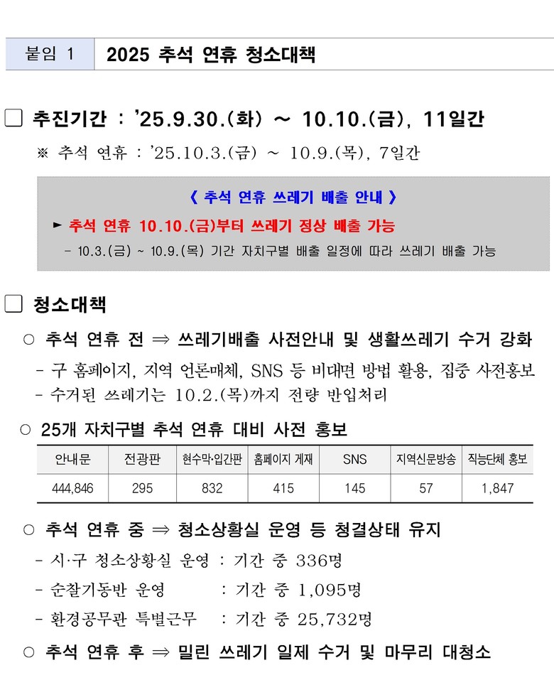 연휴가 끝난 10.10.(금)부터는 자치구별로 청소 인력과 장비를 총동원해 연휴기간 중 밀린 쓰레기를 일제 수거‧처리할 예정이다.