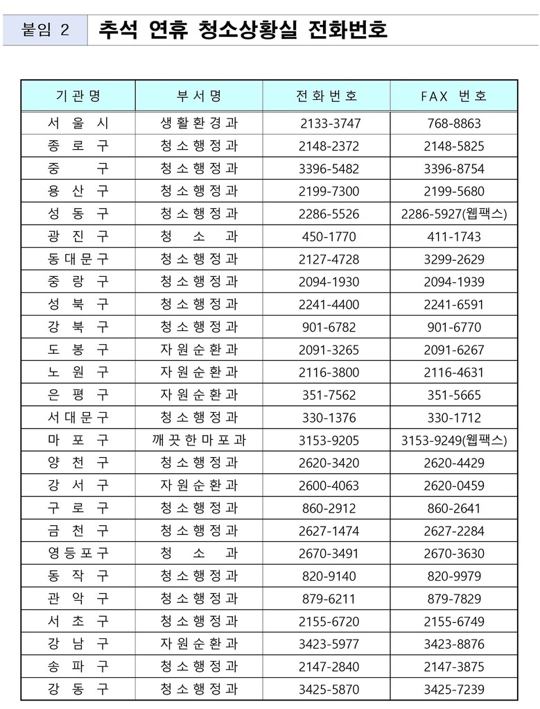 연휴 기간 청소 관련 민원은 해당 자치구 ‘청소상황실’이나 120(다산콜센터)로 문의하면 된다.