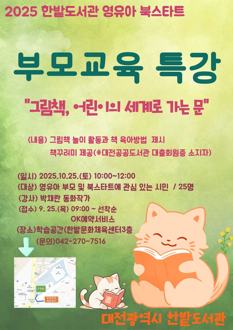 하반기 프로그램은 9월 25일(목)부터 한밭도서관 홈페이지에서 선착순 접수로 진행되며, 자세한 사항은 한밭도서관(☎042-270-7516)으로 문의하면 된다.