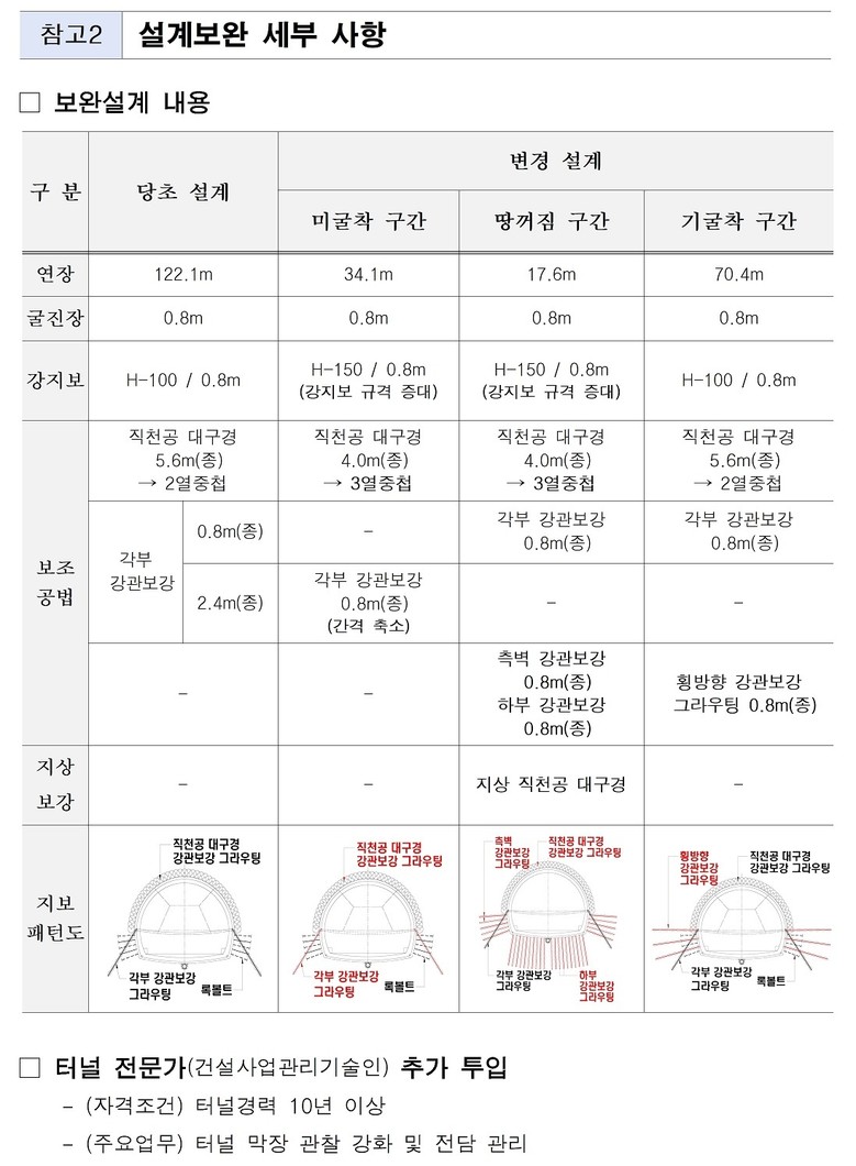 터널 굴착 전 지상부터 터널 아래까지 그라우팅을 통해 지반을 단단히 하고 터널 내 각부, 측벽, 하부는 0.8m 간격으로 그라우팅을 촘촘하게 추가 적용한다. 기존 5.6m, 2열로 겹치게 배치했던 터널 상부 지반의 그라우팅은 4m, 3열이 겹치게끔 간격을 좁히고 외력 하중에도 최대한 견딜 수 있도록 터널 안을 떠받치는 철골 구조물(강지보)도 기존 H-100에서 두껍고 강한 H-150로 강화한다.