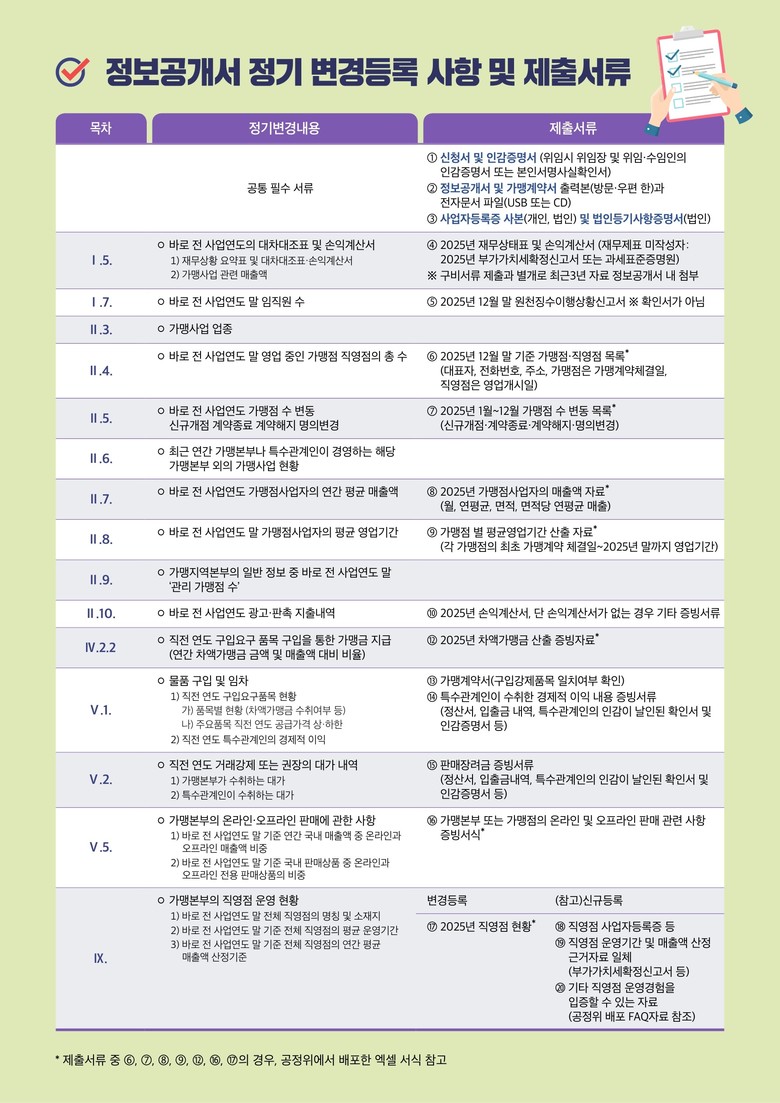 「가맹사업거래의 공정화에 관한 법률」에 따르면 가맹본부는 매년 사업연도 종료 후 120일 내에 재무상태표 및 손익계산서, 가맹점 수와 가맹점 평균 매출액 등 30여 개 정보를 변경하여 가맹본부가 등록된 주사무소 소재지 담당 시·도에 변경등록을 해야 한다.