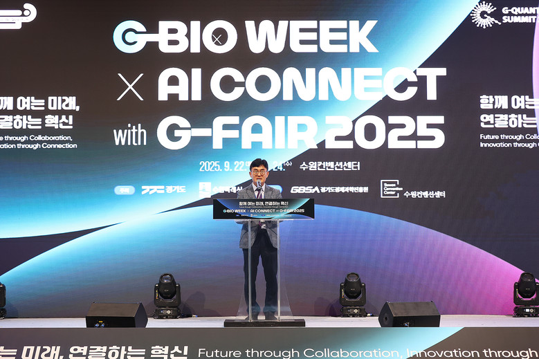 | ▲ 김현곤 경과원장이 22일 오후 수원컨벤션센터에서 열린 ‘G-BIO WEEK X AI Connect With G-FAIR 2025’에 참석해 인사말를 하고 있다.(사진=경과원) |