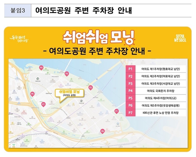 행사 참여 시민들은 여의도공원 주차 공간이 협소한 점을 감안해 가급적 대중교통 이용을 권장한다. ※여의도공원 주변 주차장 ‘붙임3’