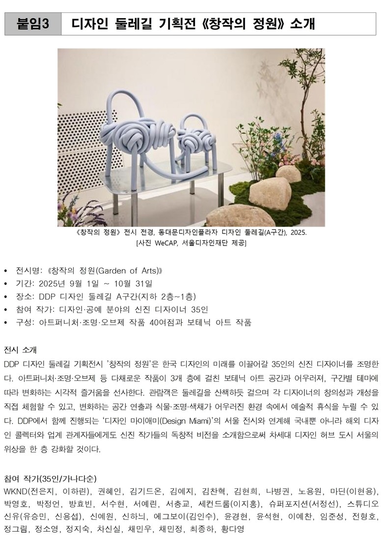 서울의 디자인 흐름은 이어진다. 국내 신진 디자이너 35인이 참여한 기획전시《창작의 정원》은 디자인 둘레길(A구간)에서 10월 31일까지 열리며 <서울디자인위크>, <서울디자인어워드> 등이 개최될 예정이다.