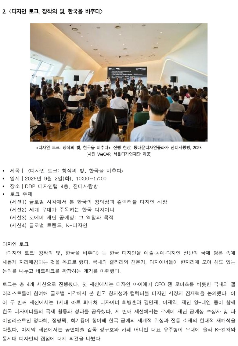 전시와 함께 9월 2일(화)에 진행된 ‘디자인 토크’는 총 4개 세션으로 구성되어, 국내외 전문가들이 한국 디자인의 정체성과 글로벌 시장 내 경쟁력을 공유하는 시간을 가졌다.