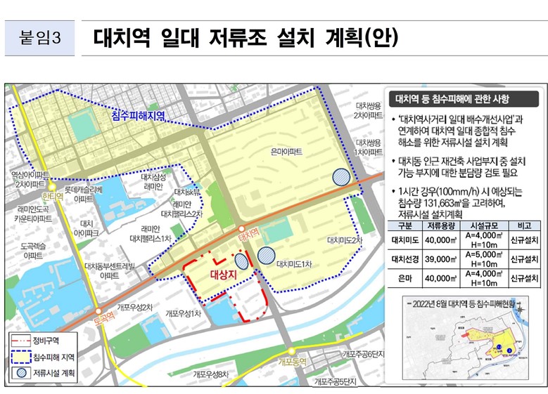 - 시 “재난으로부터 시민 보호하고 지속 가능한 서울 만드는 데 ‘공공기여’ 적극 활용” [서울 세계타임즈=이장성 기자] 재건축을 앞둔 강남구 대치역사거리 인근 미도.은마.선경아파트는 지난해 정비사업과 연계한 ‘공공기여’ 방식으로 약 11만 9천 톤 규모 저류시설을 공동 설치.부담하는 방안을 마련했다. 이들 단지는 개발사업에서 발생한 이익으로 주거지 일대 침수를 막아줄 기반시설을 확충하고 사전에 재난 예방시설을 확보한 모범 사례로 평가받고 있다.