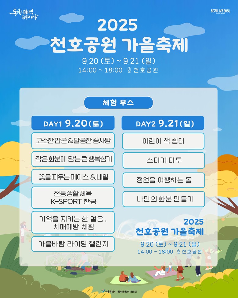 ‘2025 천호공원 가을축제’에서 준비한 모든 공연과 체험프로그램은 현장에서 누구나 무료로 참여할 수 있다.
