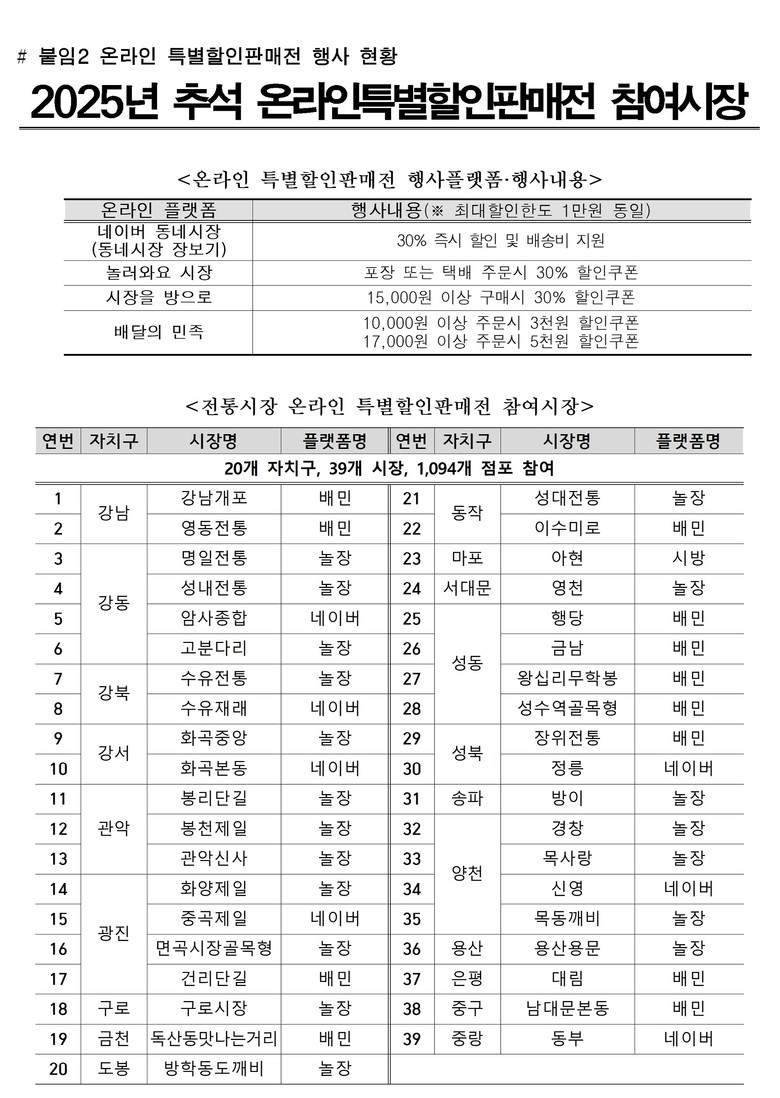 - (9.25.~10.9.) 24개 자치구 61개 전통시장서 ‘2025년 추석 명절 특별이벤트’ 개최