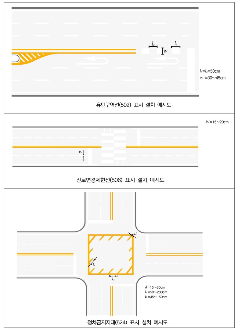 주요 개선 내용은 ▲원활한 유턴 유도를 위한 유턴구역선 길이 조정 ▲교차로 무리한 진입 방지를 위한 정차금지대 설치 ▲상습 정체 구간에서 끼어들기 억제를 위한 진로변경제한선 연장 ▲보행자 보호를 위한 횡단보도 전방 정지선 이격 확대(3m→5m) 등이다.