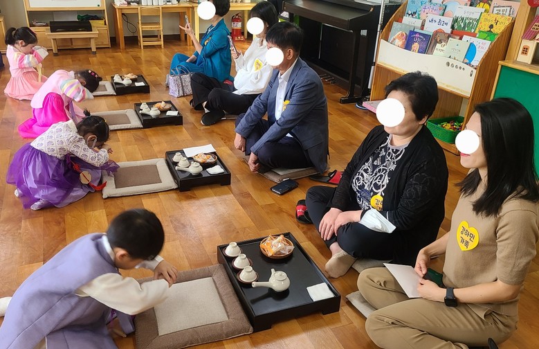 ◦ 3월부터 월 1회 배워온 다도 예절을 유아들이 조부모, 부모를 초대하여 차를 대접하며 다도 실천