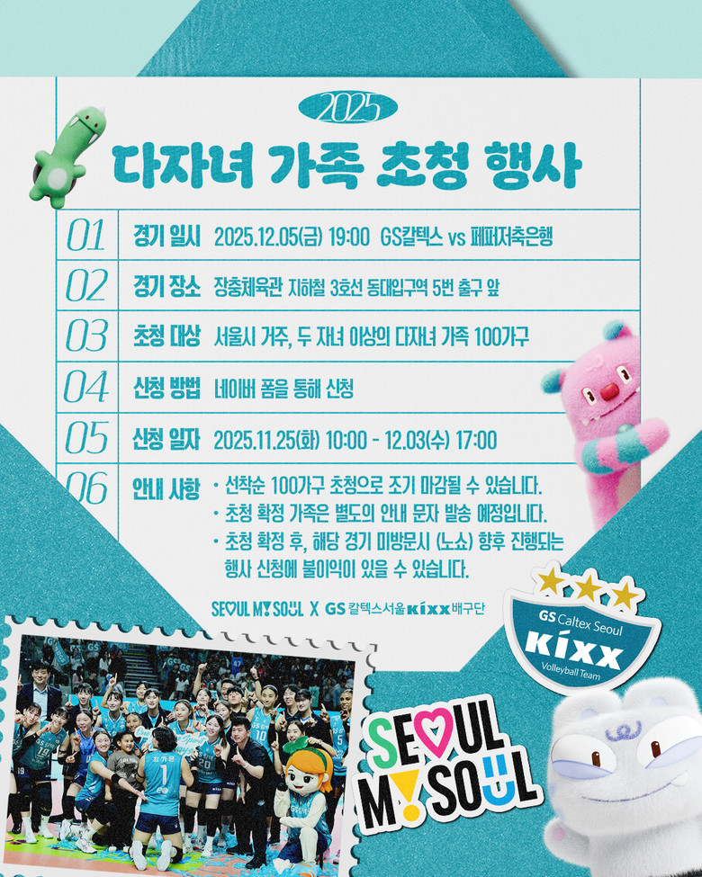 ‘GS칼텍스서울Kixx배구단’과는 지난해 다자녀 100가족을 홈경기에 무료로 초청하는 행사를 진행한 바 있다.