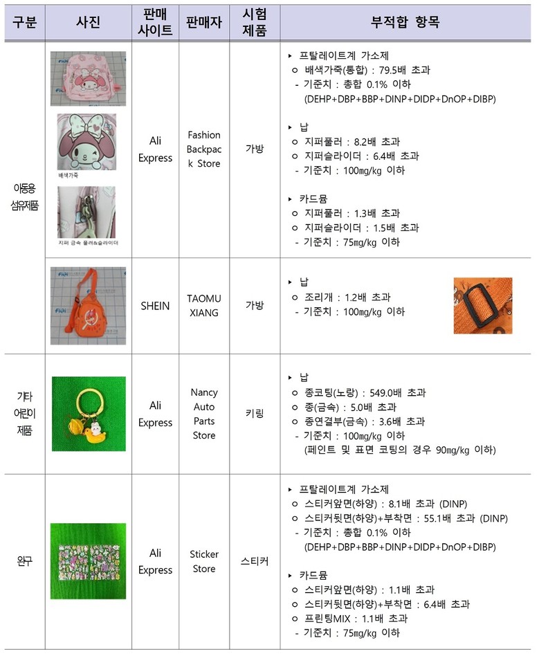 - ‘필통, 가방, 키링 등’ 유해물질 국내 기준치 초과, 물리적 기준 미달… ‘판매 중단 요청’