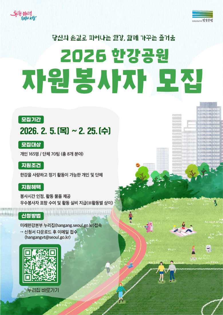 또한, 단체 봉사자를 위한 활동도 지속된다. ▲환경정화와 녹지대 가꾸기를 통해 한강 전역을 돌보는 ‘한강 지킴이’ ▲예술적 재능으로 노후 시설물을 새롭게 꾸미는 ‘재능기부 벽화봉사단’ 등 기존의 인기 분야에 신규 기획형 봉사단을 더해, 보다 풍성하고 체계적인 자원봉사 생태계를 구축할 계획이다.