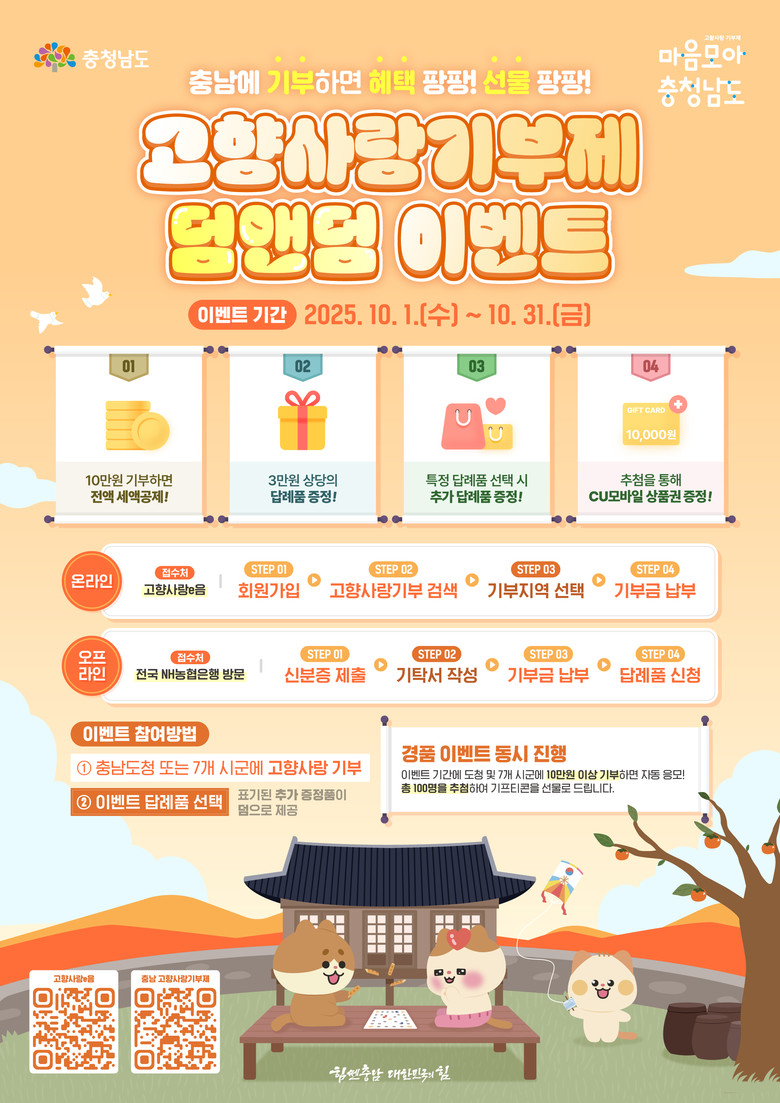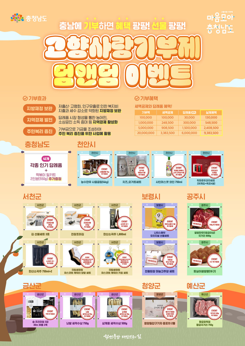 고향사랑기부제의 활성화를 위해 마련한 이번 이벤트는 도와 7개 시군에 10만원 이상 기부 시 기존 10만원 세액공제와 3만원 상당 답례품 외에 특정 답례품 선택 시 덤으로 추가 답례품을 증정한다.