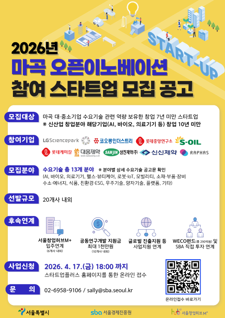 - 시, “대기업 협업 기반 스타트업 성장 지원…마곡 산단 내 동반성장 지원 확대할 [서울 세계타임즈=이장성 기자] 서울시는 마곡산업단지 내 대·중소기업과의 협업 기회를 기반으로 유망 스타트업을 발굴하기 위해 ‘서울창업허브 M+’의 입주기업 모집과 ‘마곡 오픈이노베이션’ 프로그램을 동시에 추진한다.