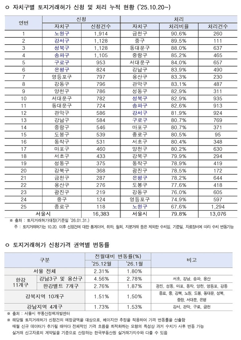 서울 전역 토지거래허가제 시행 이후 ’26년 1월 말 기준 아파트 토지거래허가 누적 신청건수는 총 16,683건으로, 이 중 13,076건(79.8%)이 처리됐다.