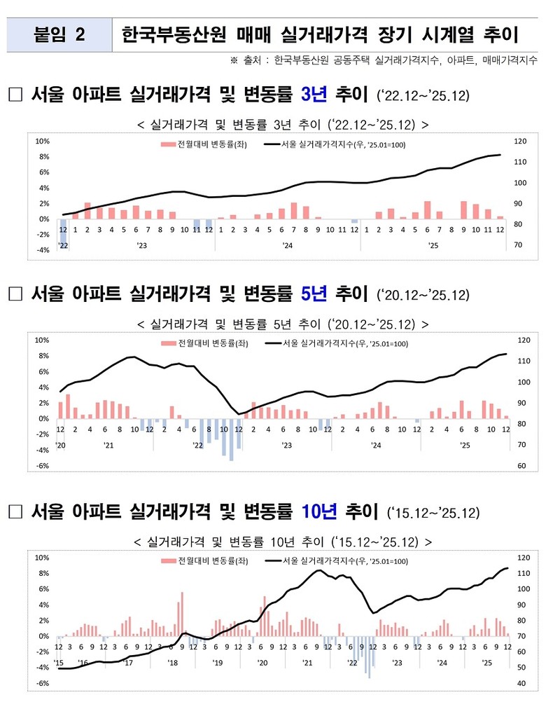 12월 실거래가격지수는 2025년 12월 1일부터 31일까지 체결된 매매계약 중 부동산 거래신고 등에 관한 법률에 따라 계약체결일로부터 30일 이내 신고가 완료된 실거래 자료 전수를 분석해 산출했다.