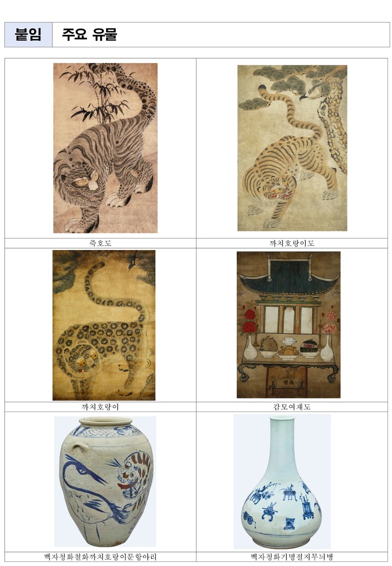 특히 케이팝 데몬 헌터스로 관심이 높은 ‘호랑이와 까치’가 등장하는 민화 유물 2점과 호랑이가 등장하는 민화인 ‘죽호도’ 1점을 함께 선보이며 현지의 눈길을 모으고 있다. 호랑이와 까치에 대한 인지도가 높은 만큼, 이들이 전하는 긍정적 기운과 길상의 메시지를 소개함으로써 민화의 매력을 더욱 폭넓게 알리고 있다.