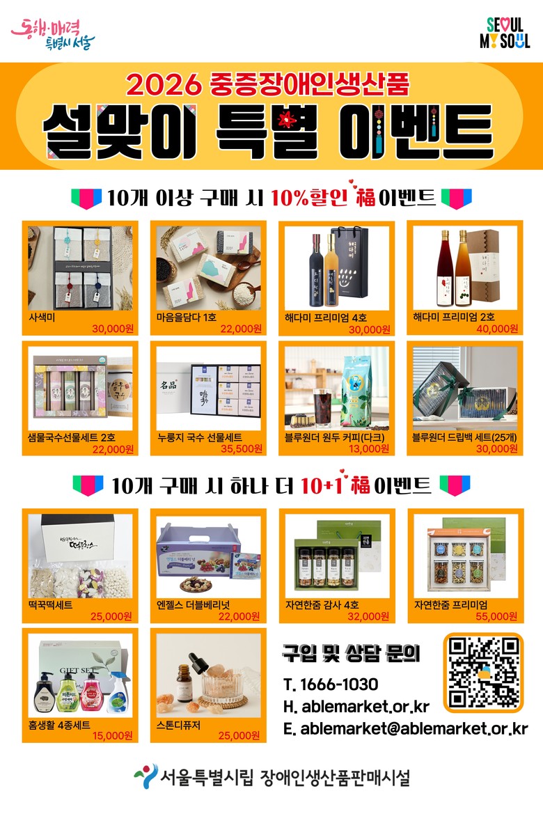 서울시와 시립장애인생산품판매시설에서 주최하는 「2026년 중증장애인생산품 설맞이 기획전」에서는 설날 답례품으로 적합한 12종 93개의 물품을 마련해 판매하고 있다.