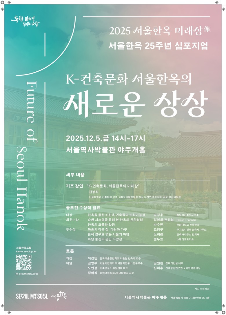 - K-건축문화 ‘일상 속 새로운 한옥’ 미래상 확산, 시민·전문가 창의적 상상 소통의 장 [서울 세계타임즈=이장성 기자] 서울시가 한옥 정책 25주년을 맞아 ‘한옥의 새로운 상상’을 함께 공유하는 심포지엄을 연다. 12월 5일(금) 오후 2시 서울역사박물관 야주개홀에서 열리는 이번 행사는 전문가와 시민 누구나 참여할 수 있다.
