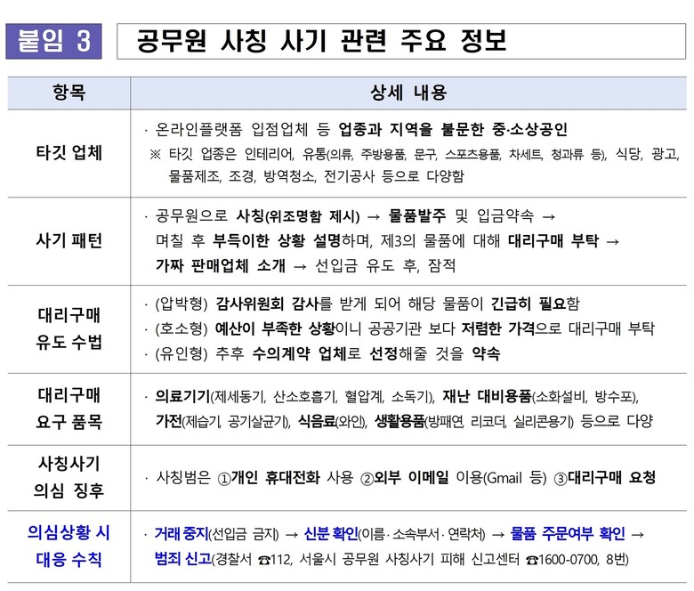 사칭범들은 공무원을 사칭해 위조 명함이나 허위 공문을 내세워 물품을 대량으로 주문하고, 며칠 뒤 제3의 가짜 판매업체를 소개해 ‘대리구매’를 요청해 대금을 선입금하게 만드는 수법을 주로 이용한다.