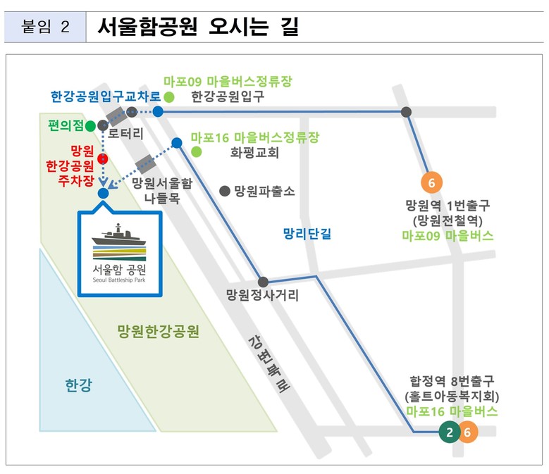 서울함공원은 지하철 2·6호선 합정역에서 마을버스 16번 또는 6호선 망원역에서 마을버스 9번을 이용, ‘망원한강공원‧서울함공원’에서 하차하면 편리하게 도착할 수 있다. 주차장이 협소한 점을 감안, 방문 시 대중교통 이용을 적극 권장한다.