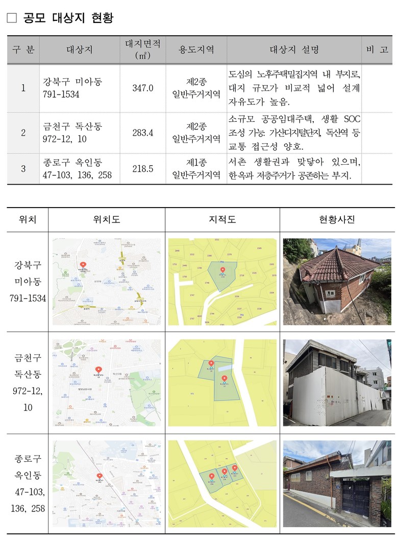참가자는 SH 관리 3개 대상부지(강북구 미아동 791-1534, 금천구 독산동 972-10 등, 종로구 옥인동 47-103 등)를 선택해 임대주택 또는 생활기반시설 등 조성 디자인안을 세로 A0 크기의 편집 원본 파일 등으로 작품 여러 점 제출이 가능하다.