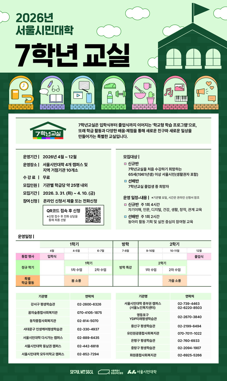 아울러 서울시민대학 4개 캠퍼스에 서울 시내 10개 거점기관을 추가 지정해 총 14곳에서 운영하며, 참여 신청은 3월 31일(화)부터 4월 10일(금)까지 접수한다.