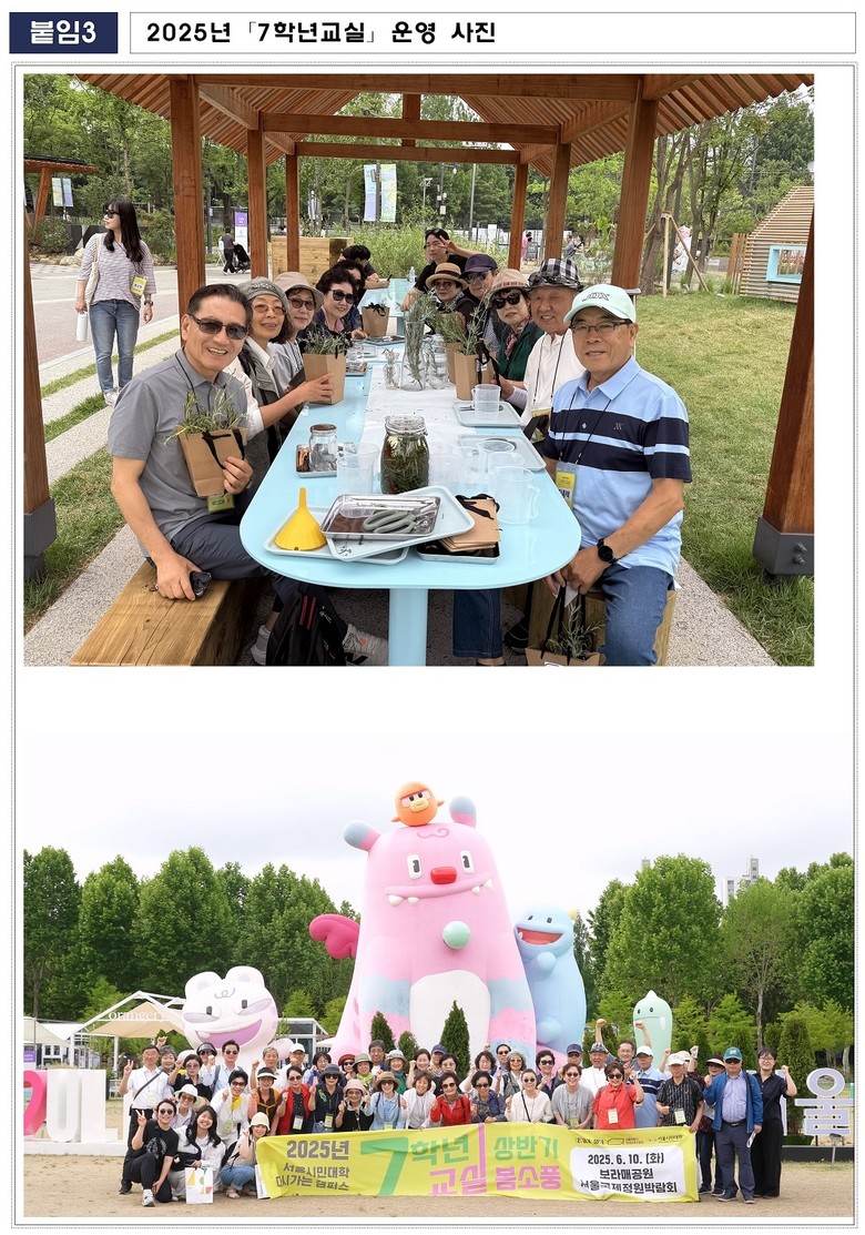 ‘7학년교실’은 초고령사회에 대응해 시니어의 사회적 관계 확장과 건강한 노후를 지원하기 위해 서울시민대학이 운영하는 생애주기별 교육과정이다. 입학식부터 반장 선거, 소풍, 졸업식까지 1년간 학급 단위로 운영되는 ‘학교형 학습 프로그램’으로, 단순 강좌를 넘어 참여자 간 관계 형성에 중점을 둔 것이 특징이다.
