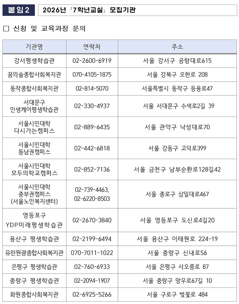 올해 7학년교실은 운영 규모를 대폭 확대했다. 선발 인원을 전년 250명 대비 180% 규모로 늘려 총 450명을 선발하며, 서울 시내 평생학습관·사회복지관 10곳을 거점기관으로 새로 지정했다. 이를 통해 교통약자인 노년층이 거주지 인근에서 참여할 수 있게 됐으며, 교육과정 표준화로 기관 간 교육 수준의 균질성도 확보했다.