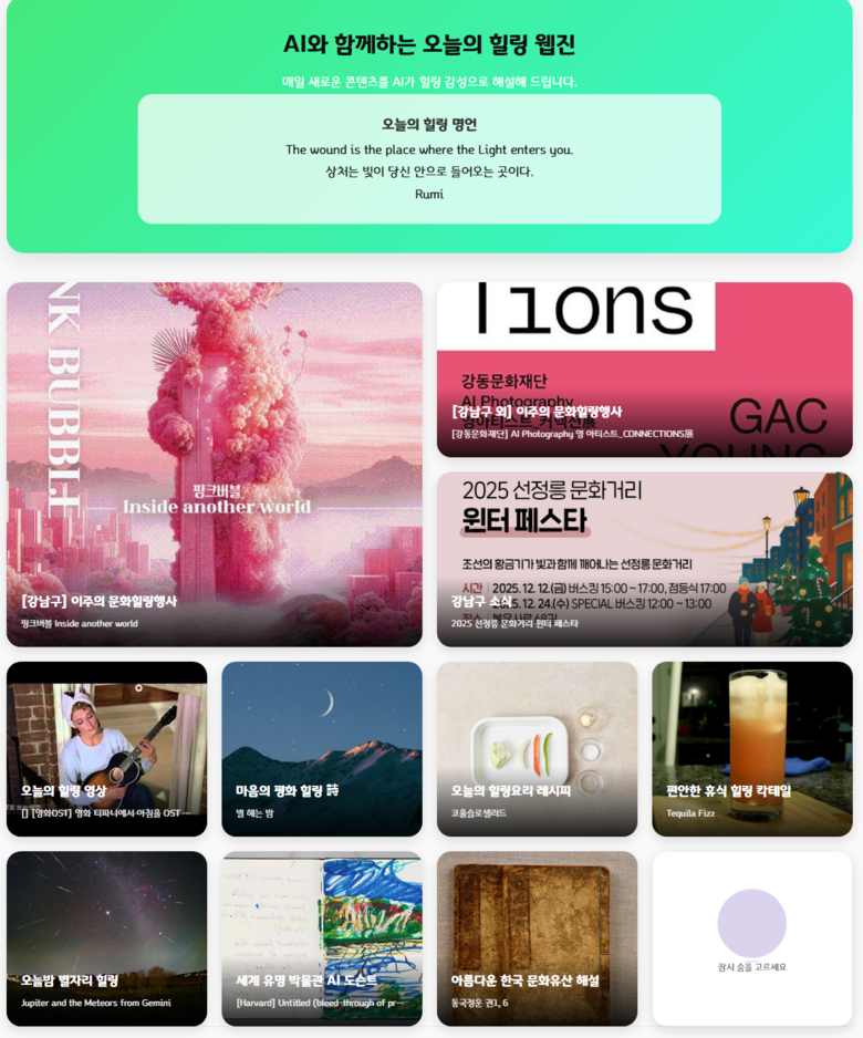 웹진이 제공하는 8가지 핵심 콘텐츠는 인문, 예술, 미식, 정보 등 다방면에서 정서적 안정을 돕는다. 먼저 AI가 엄선한 긍정 메시지인 ‘힐링 명언’과 전 세계 명시를 감성적으로 해설한 ‘힐링 詩’는 문학적 사색을 제공한다. 메트로폴리탄 등 세계적 박물관의 작품을 설명하는 ‘AI 도슨트’와 검증된 영상을 레트로 감성으로 재해석한 ‘힐링 영상’은 시각적 즐거움을 더한다.